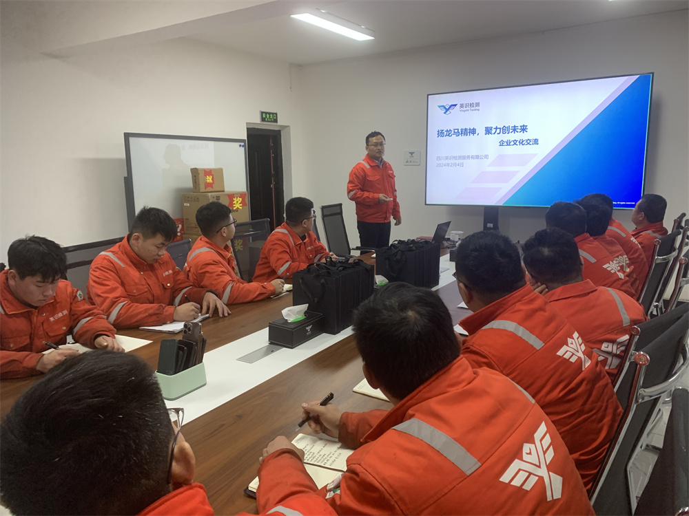 检测服务部副经理镡云九先生作《四川英识检测服务有限公司2023年度工作总结暨2024年度工作规划》报告。报告回顾了2023年四川英识各项工作成果,在内部业务量大幅度降低的情况下,外部市场开拓业绩显著提升,整体业绩较22年有增长;检测资质进一步提升,对CMA\CNAS资质技术能力进行扩项,获得超声检测能力、防喷器检测标准,增加了三大项、八小项涉固井压裂管汇、钻采设备和钻通设备的检测能力;人员检测能力较22年持证人员成倍增加;安全管理效果显著,全年未发生一起可记录安全事故。镡经理也将各部门的不足进行了报告,对四川英识2024年的工作做规划,务必要加强市场开拓,加强英识品牌宣传,加强人员能力提升,持续进行资质能力的扩项。